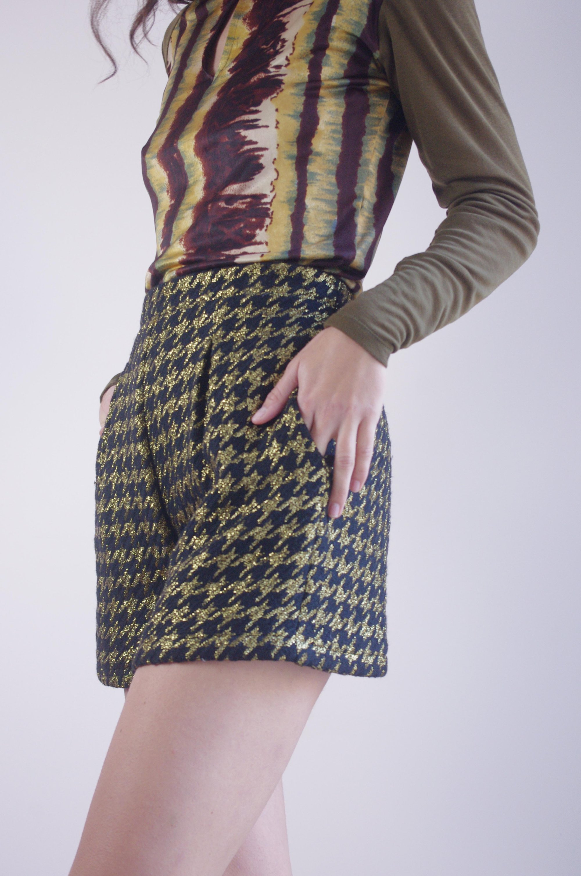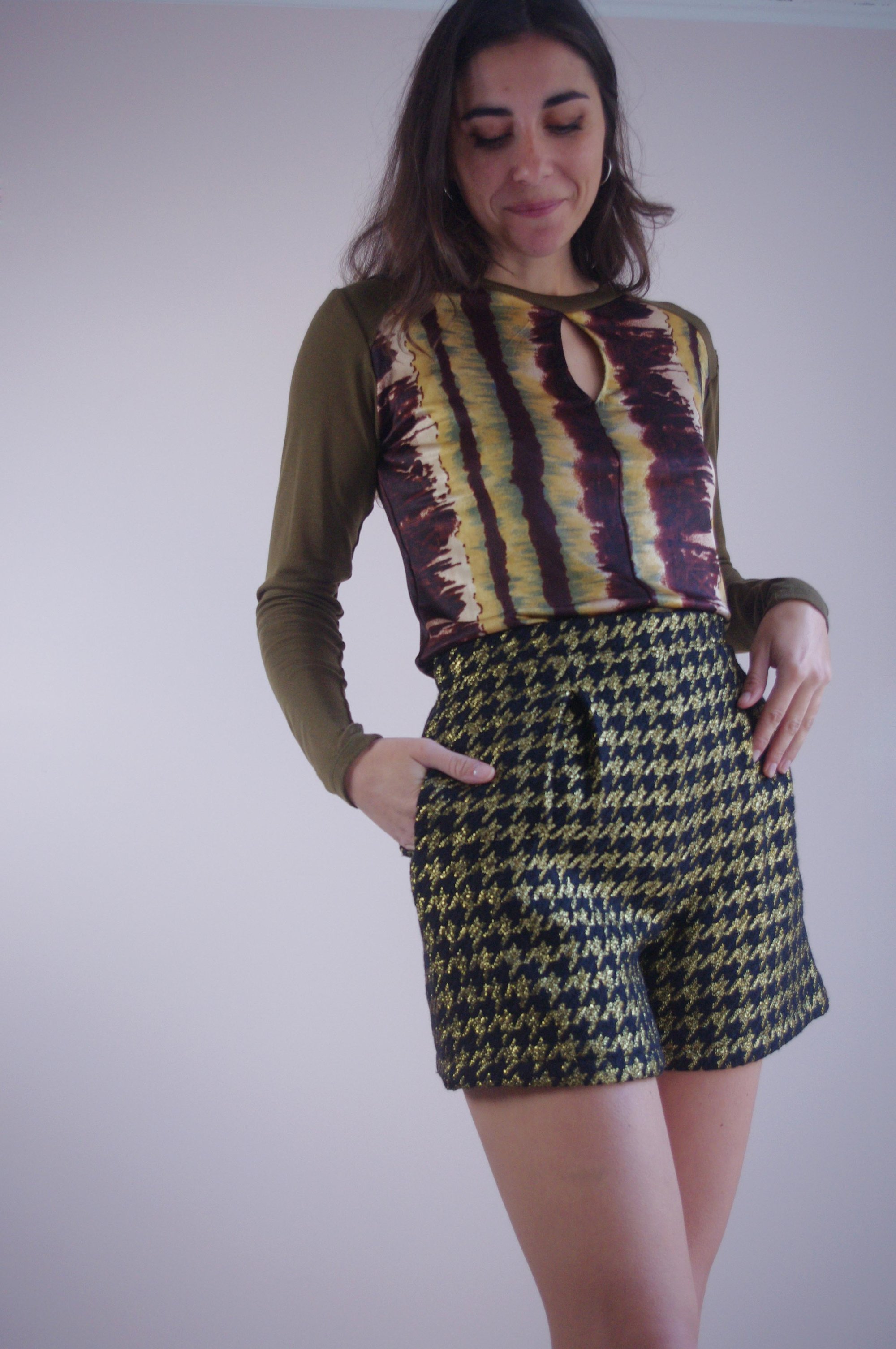 Le Short Lyra illumine les journées grises avec son pied-de-poule tissé de fils dorés. Une coupe courte et structurée, des pinces élégantes, de vraies poches pratiques et une ceinture élastiquée au dos pour un confort sans faille.